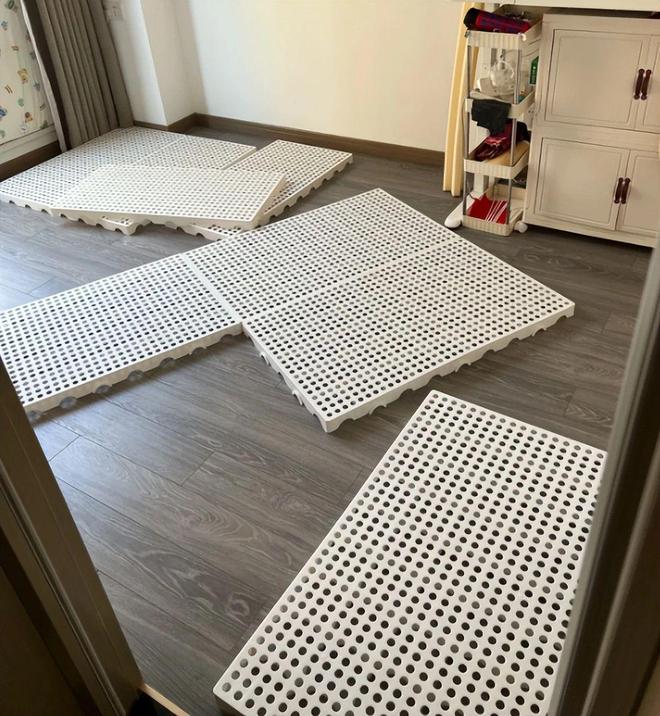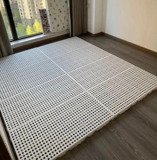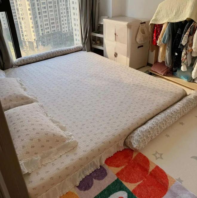 这种拼接床高度比较低,也很适合有小宝宝的家庭,铺上垫子让宝宝在上面爬,完全不用担心会摔下来。