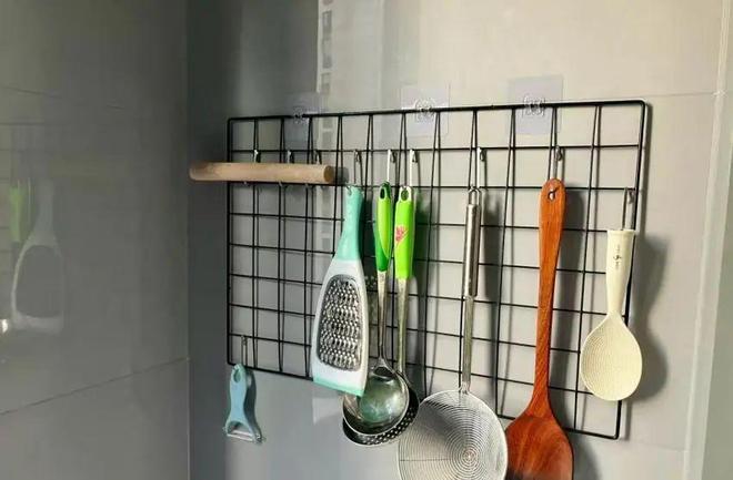 收纳铁网用在厨房也是一个不错的选择,配上挂钩收纳各种饭勺锅铲,取用也很方便。
